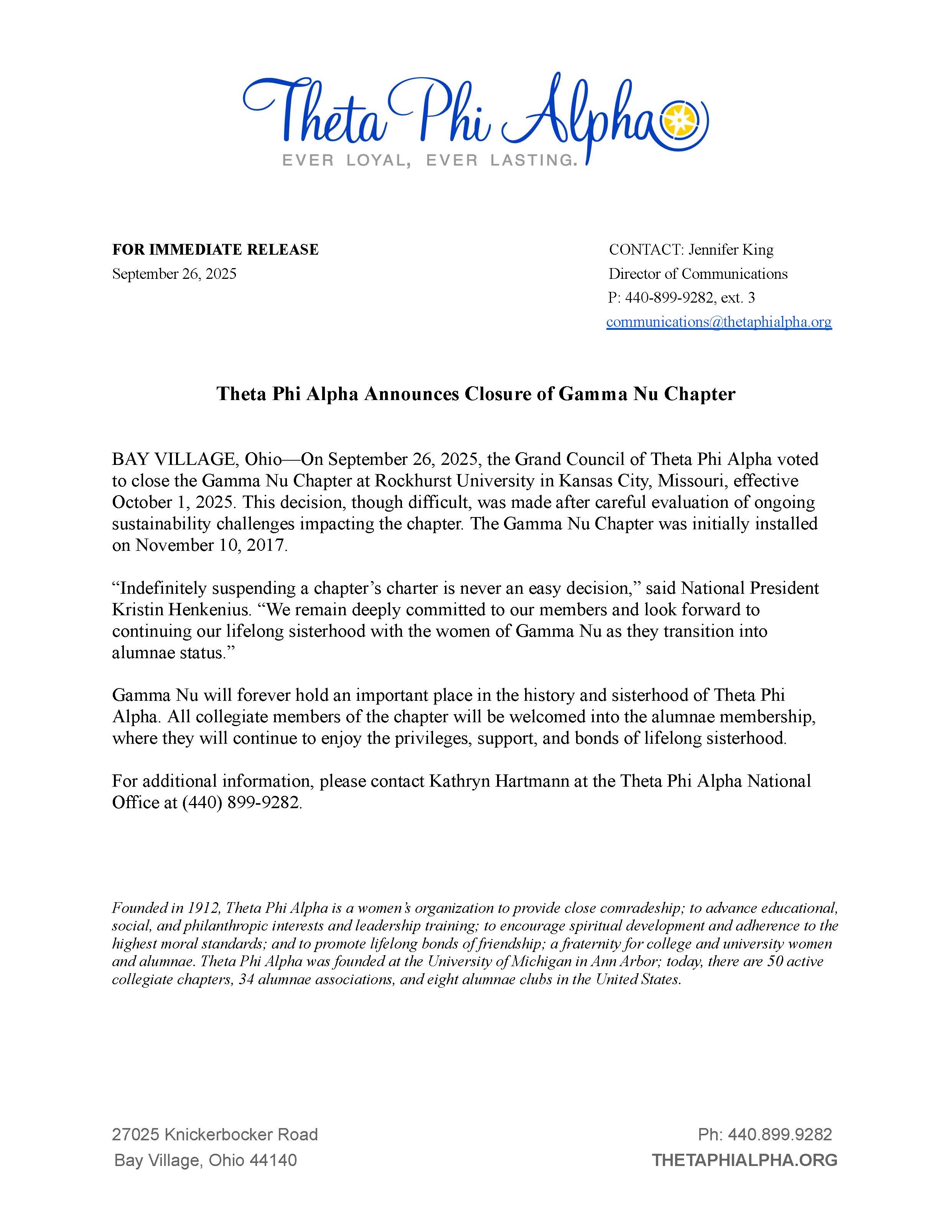 BAY VILLAGE, Ohio—On September 26, 2025, the Grand Council of Theta Phi Alpha voted to close the Gamma Nu Chapter at Rockhurst University in Kansas City, Missouri, effective October 1, 2025. This decision, though difficult, was made after careful evaluation of ongoing sustainability challenges impacting the chapter. The Gamma Nu Chapter was initially installed on November 10, 2017.