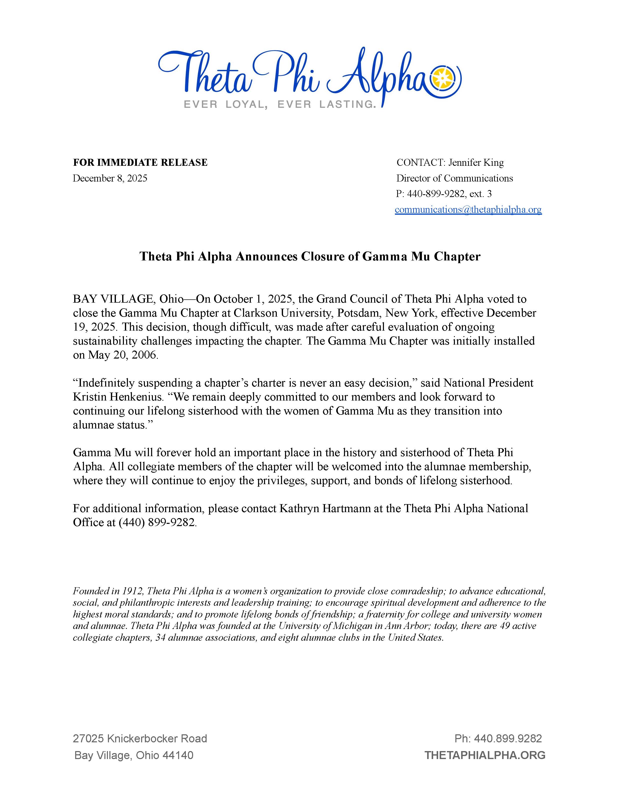 BAY VILLAGE, Ohio—On October 1, 2025, the Grand Council of Theta Phi Alpha voted to close the Gamma Mu Chapter at Clarkson University, Potsdam, New York, effective December 19, 2025. This decision, though difficult, was made after careful evaluation of ongoing sustainability challenges impacting the chapter. The Gamma Mu Chapter was initially installed on May 20, 2006.
