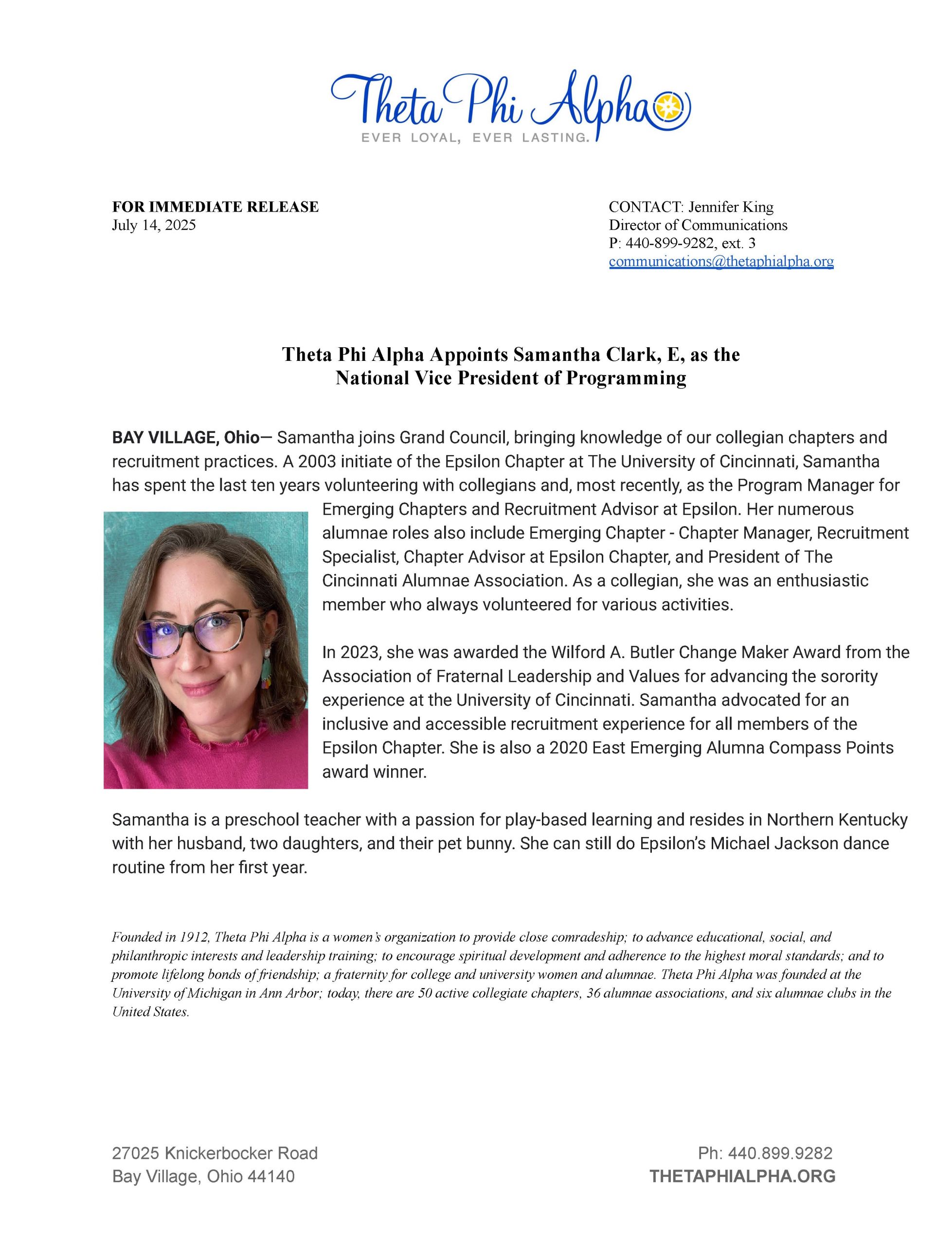 BAY VILLAGE, Ohio— Samantha joins Grand Council, bringing knowledge of our collegian chapters and recruitment practices. A 2003 initiate of the Epsilon Chapter at The University of Cincinnati, Samantha has spent the last ten years volunteering with collegians and, most recently, as the Program Manager for Emerging Chapters and Recruitment Advisor at Epsilon.