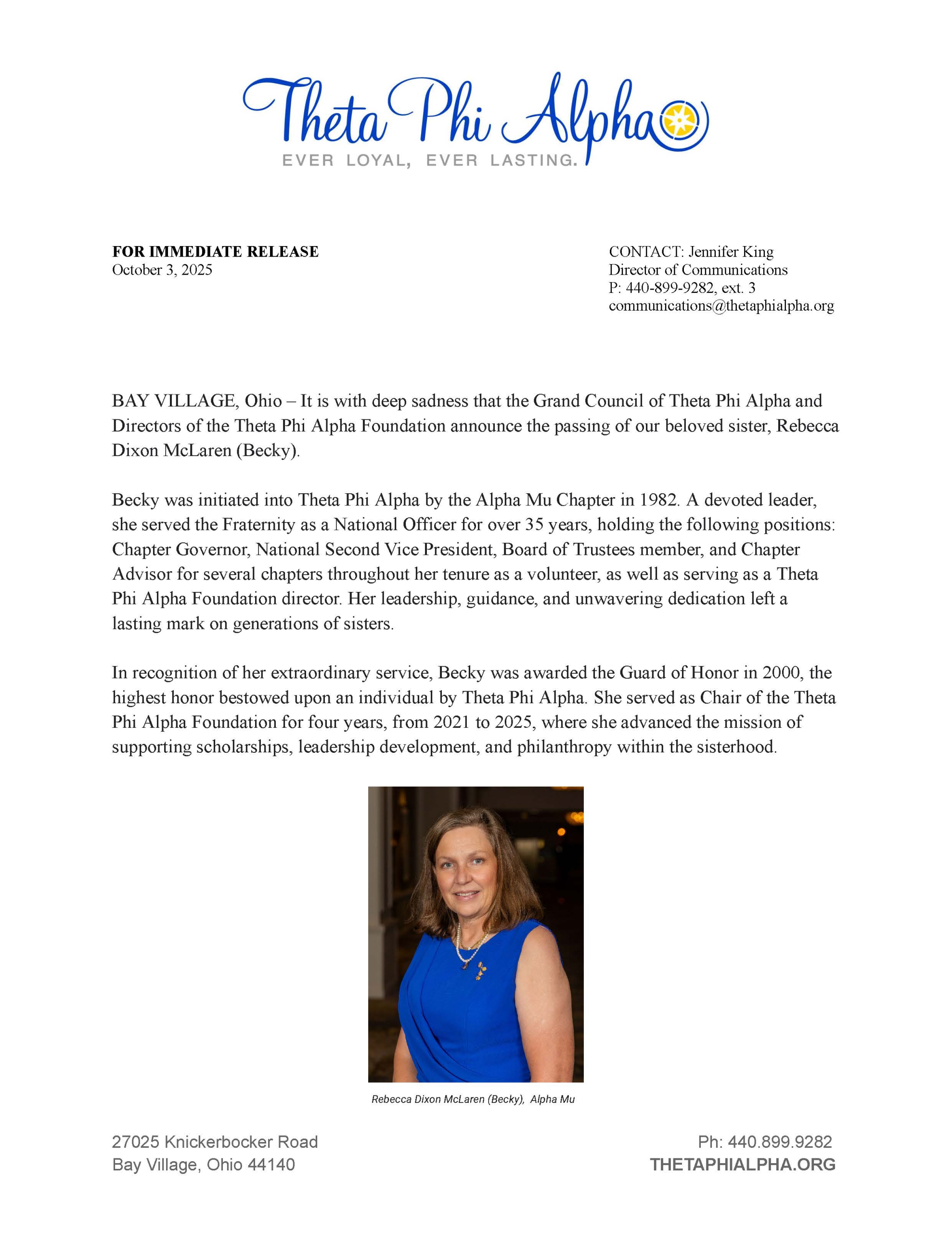 BAY VILLAGE, Ohio – It is with deep sadness that the Grand Council of Theta Phi Alpha and Directors of the Theta Phi Alpha Foundation announce the passing of our beloved sister, Rebecca Dixon McLaren (Becky).